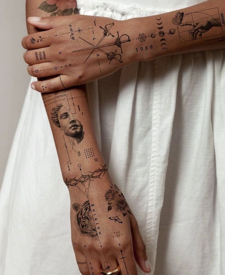 Yazı dövmeleri de trend oluyor. Eskiden gizlice saklanan kelimeler ve alıntılar artık ellerde veya boyunlarda göze çarpan bir şekilde yer alıyor. İsimler, tarihler veya anlamlı sözler, ince kaligrafi stiliyle kimliğin görünür işaretleri olarak kullanılıyor.